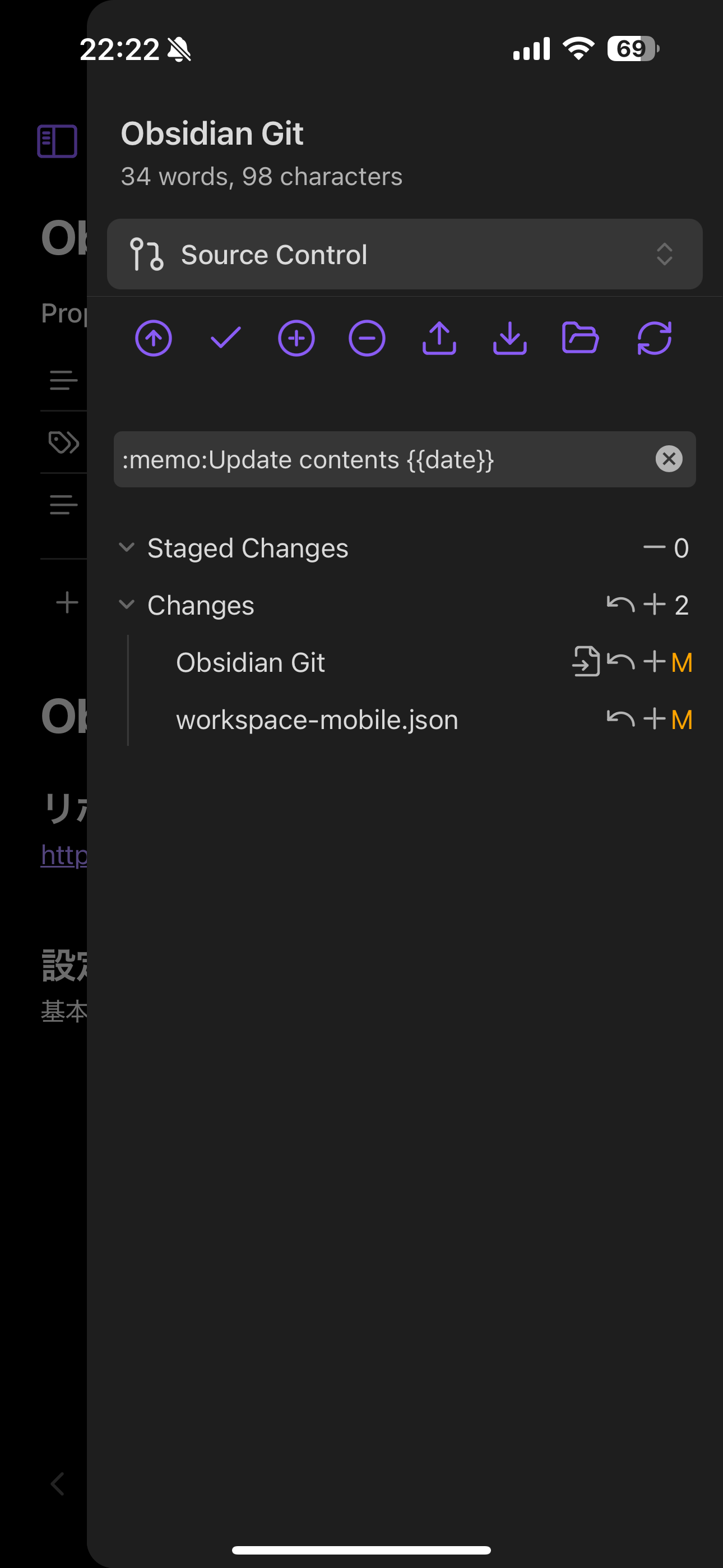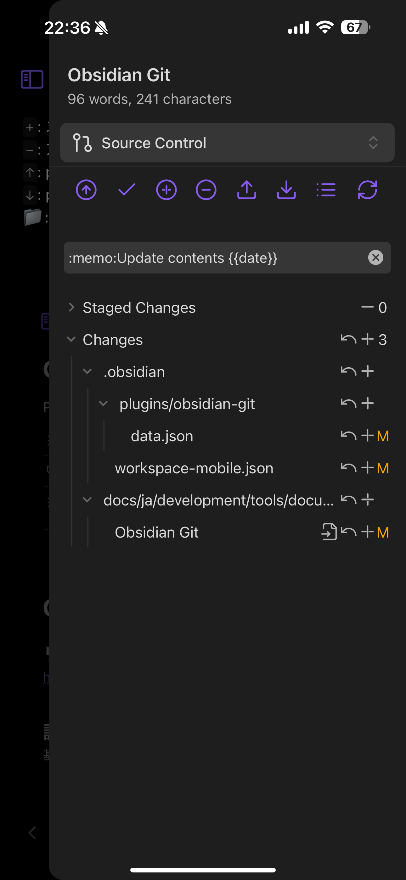 • コミットメッセージはOpen Git control viewで指定できるが、obsidian gitのプラグインの設定から設定可能。